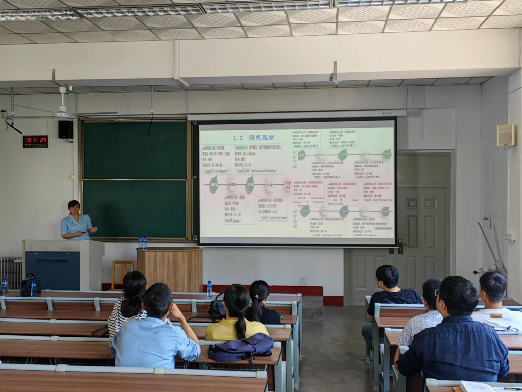 夏秀芳教授分享了题为《天然色素-多糖可视化指示膜制备及其监测肉类食品新鲜度的动态变化》的报告,报告研究天然色素和多糖可视化指示膜的开发及应用,探究指示膜在室温(25 ℃)和冷藏(4 ℃)条件下对畜禽肉新鲜度的监测效果,最终通过多种结果表明天然色素可以作为智能指示膜的优良pH敏感指示剂来监测肉制品的新鲜度。刘骞教授作了题为《基于“清洁标签”理念创新发展功能性肉制品》的报告,向大家分享了在清洁标签食品的大形势下,氯化钾、氯化镁等氯化钠替代物已经不被研究者和消费者所接受,直接降低食盐含量才更加符合“清洁标签”理念,并阐述了食盐含量的降低会显著影响肉制品的质构、风味和货架期等相关问题。刘教授着重介绍了“清洁标签理念”,并全面综述了新型加工技术在改善低盐肉制品品质方面的研究现状, 对推动新型加工技术发展有重大意义,并为生产新型健康的低盐肉制品提供理论依据。报告结束后学院教师就指示膜实际应用中遇到的问题,以及超微粉碎过程中遇到温控等技术难题进行了深入探讨。