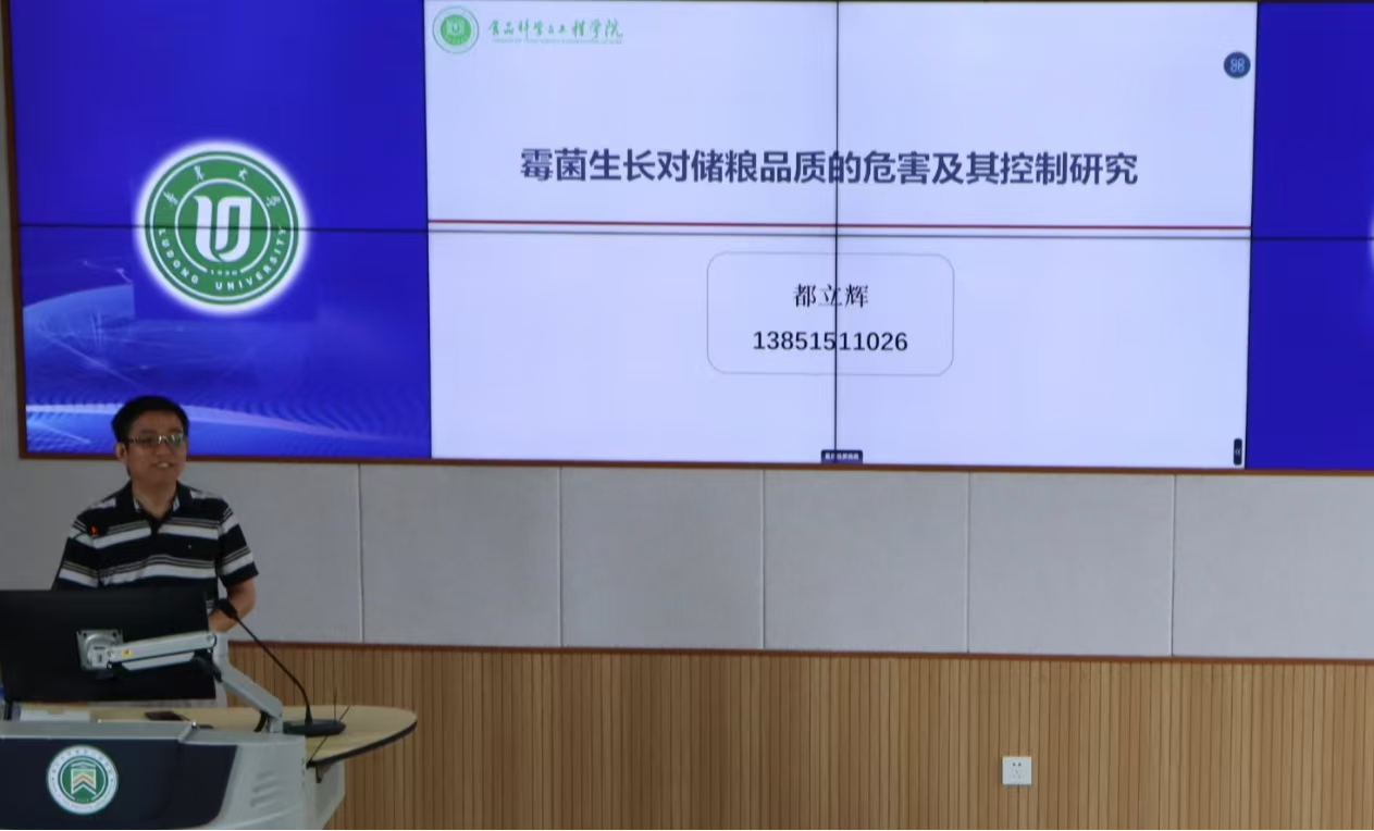 都立辉教授分享了题为《霉菌生长对储粮品质的危害及其控制研究》的报告,从霉菌的生长对储粮品质的危害及霉菌的检测和防控工作两方面展开,介绍了五大主流粮食保藏技术。报告分享了紫苏精油目前在粮食保存方面的应用及研发情况,以及未来研究方向与应用前景。