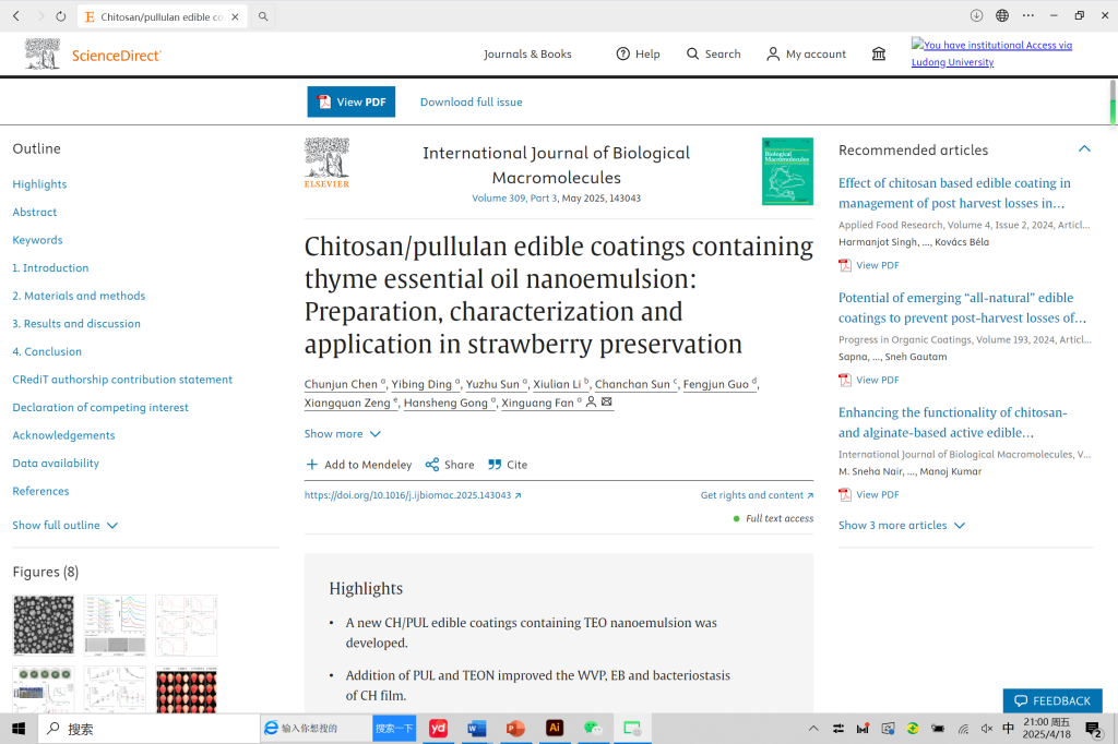 我院食品加工与安全专业研究生陈春君在Top期刊《International Journal of Biological Macromolecules》(SCI二区,IF:7.7)发表学术论文。相关研究工作得到了山东省重点研发计划项目(2024TZXD060)、山东省高校青年创新科技项目(食品纳米技术创新团队)和国家重点研发计划项目(2021YFD2100502)的支持。