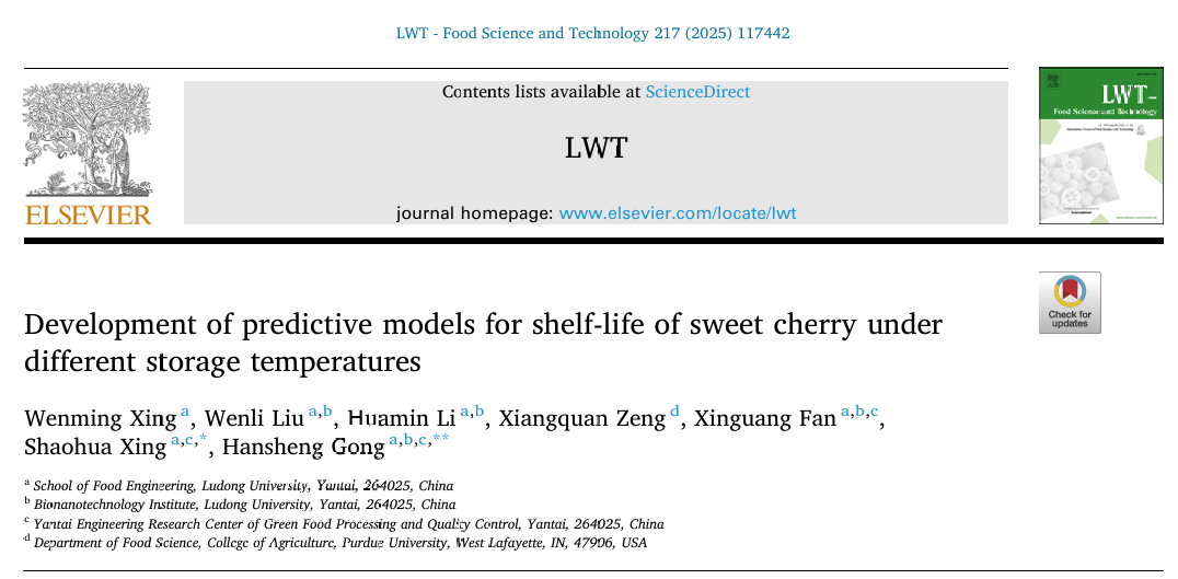 英国上市公司365果蔬加工团队在国际食品TOP期刊《LWT》(SCI一区,IF=6.0)上发表题为“Development of predictive models for shelf-life of sweet cherry under different storage temperatures”的研究论文。我院学生邢文明为第一作者,邢少华为第一通讯作者。相关研究工作得到了山东省自然科学基金(ZR2021MG008)的资助。