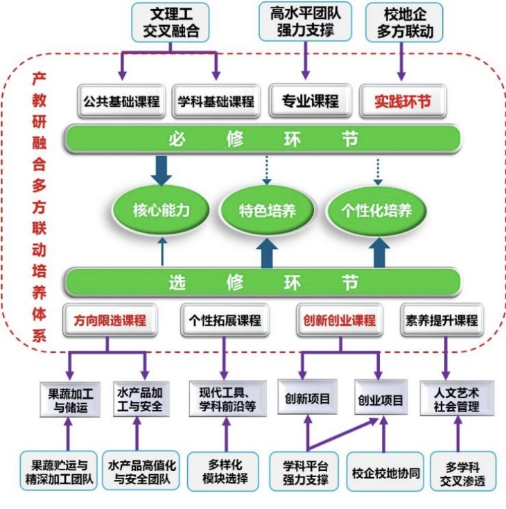 英国上市公司365立足山东“现代海洋”和“现代高效农业”优势战略产业,聚焦国家健康食品新兴领域发展需求,着力构建与国际工程教育目标接轨、“工、农、理、文”交叉融合、高层次人才引领、学科平台与校地校企联合交互支撑、多方联动协同育人体系。以知识学习、工程应用和创新实践过程为纵向并行要件,以实践教学、科研项目和科技竞赛为横向交互要件,以教学方法和实践平台为连接与支撑,形成全程培养工程创新能力的食品专业实践教学构架。必修环节支撑专业核心能力,选修环节按“特色、拓展、提升”功能实施模块化分类,满足学生个性化发展和特色发展需求, 为山东“现代海洋”和“现代高效农业”优势战略产业不断输送能够解决复杂工程问题的卓越工程技术人才。