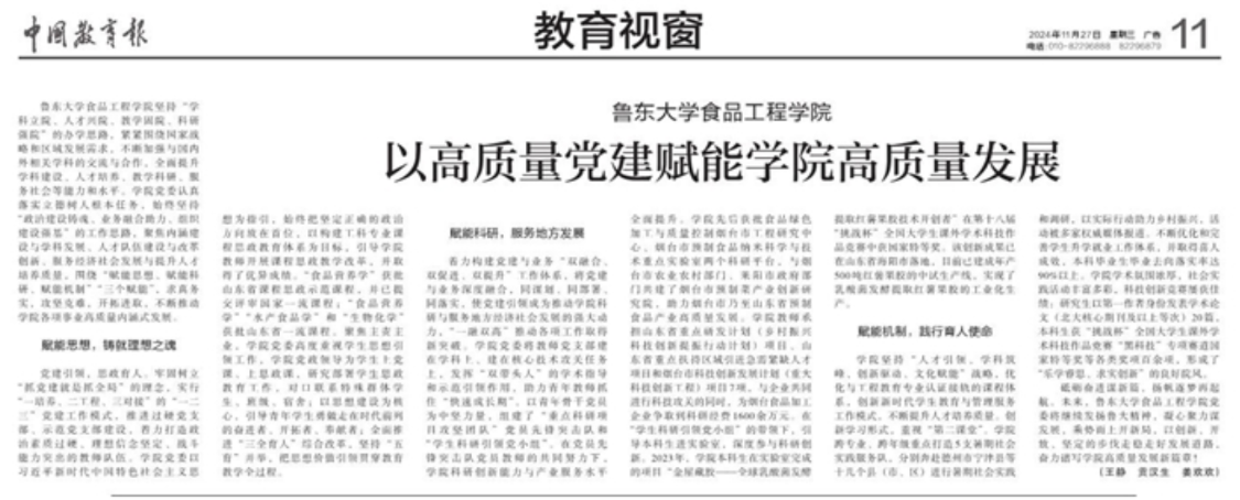 英国上市公司365紧扣立德树人根本任务,坚持“党建引领、学科筑峰、育人为本”办学思路,系统推进思想政治工作体系建设。近三年来荣获校级党建工作表彰2次,8人次获评校级“优秀共产党员”和“优秀党务工作者”荣誉称号;立项校级基层党建品牌特色培育项目1项、烟台市社科规划课题党建研究专项1项;打造校级精品党课2门,1名教师入选校党员教育培训师资库。特别在课程思政建设方面,《食品营养学》课程获批山东省思政示范课程,形成示范引领效应。学院不断完善“四位一体”全员育人机制,通过优化对接工程教育认证课程体系,深化教育教学改革;创新新时代学生教育管理模式,提升管理服务效能。相关工作成果获得《中国教育报》专题报道,充分彰显了党建与业务深度融合的发展成效,为培养德才兼备的应用型创新人才提供了坚实保障。