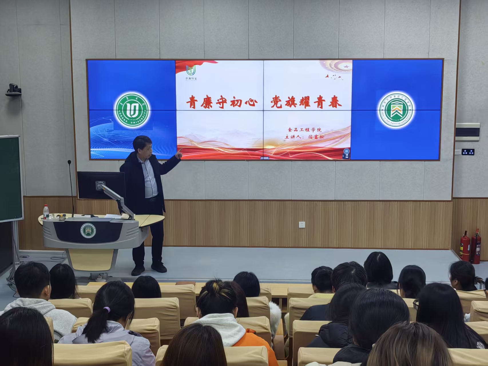 闫富松作题为“青廉守初心,党旗耀青春”的专题讲座。他结合加强党的作风建设相关要求,强调了青年党员要发扬优良作风、严守初心使命、对党和人民忠诚;结合学科特点,食品直接关乎人民群众的生命健康与安全,青年党员作为行业的中坚力量,必须坚守科研诚信与学术道德的底线,扣好廉洁从业的“第一粒扣子”,做到“心有所畏、言有所戒、行有所止”,以实际行动践行党的宗旨,守护人民群众“舌尖上的安全”。