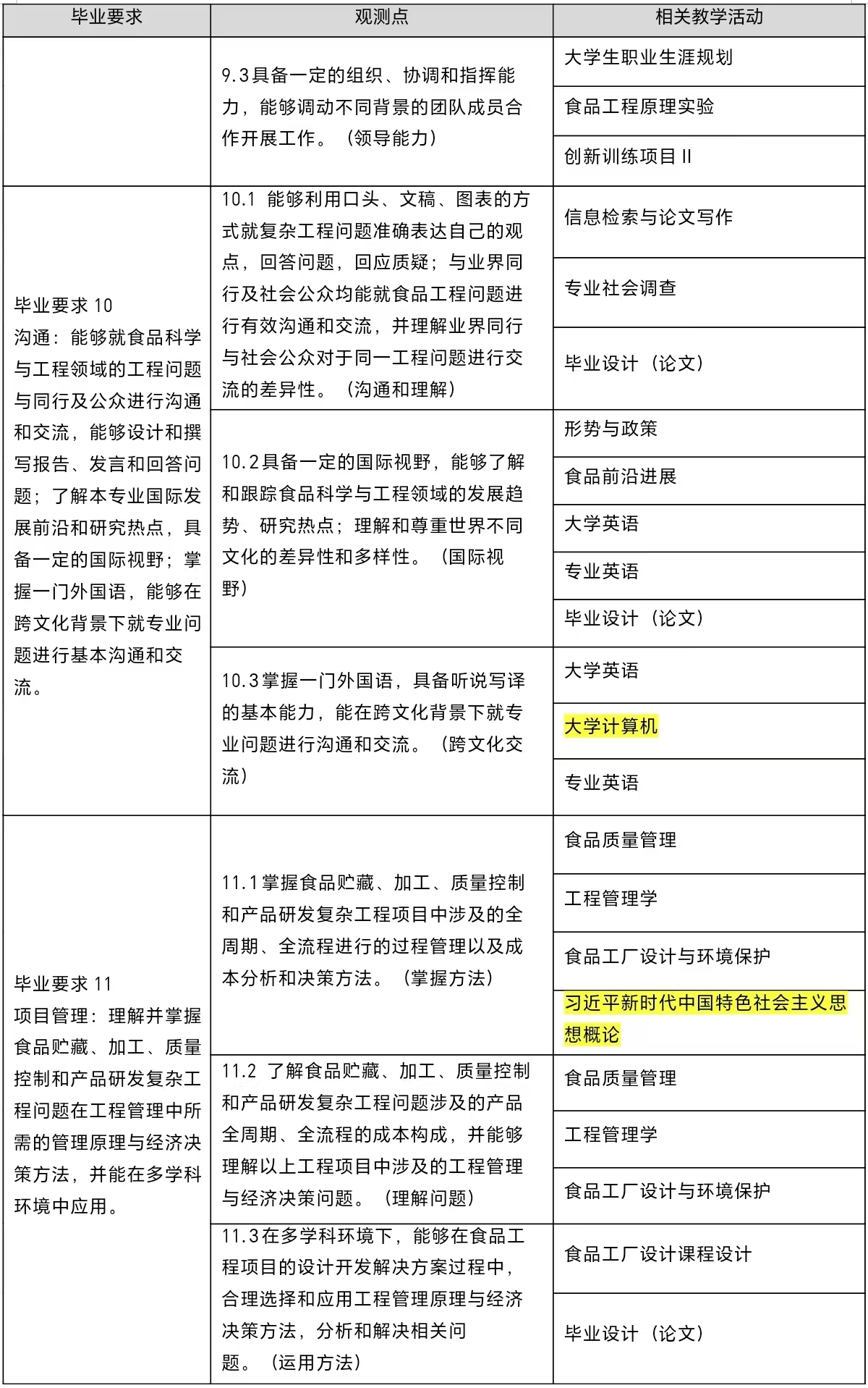 10.沟通:能够就食品科学与工程领域的工程问题与同行及公众进行沟通和交流,能够设计和撰写报告、发言和回答问题;了解本专业国际发展前沿和研究热点,具备一定的国际视野;掌握一门外国语,能够在跨文化背景下就专业问题进行基本沟通和交流。