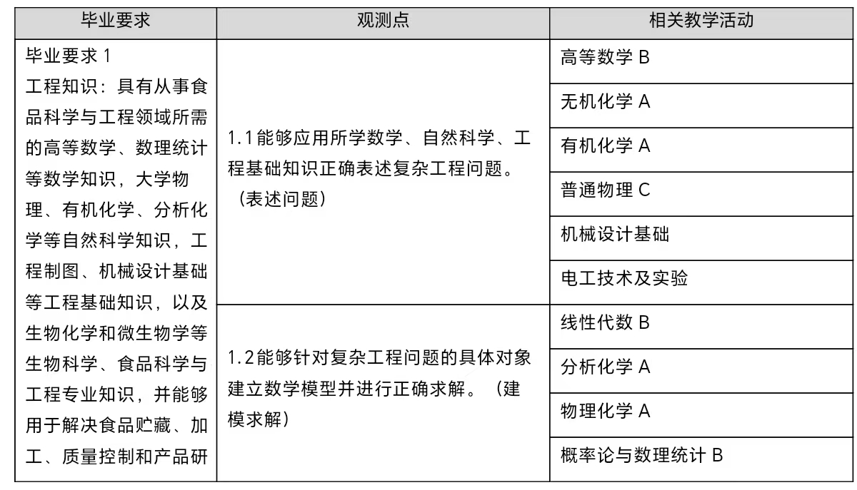1. 工程知识:具有从事食品科学与工程领域所需的高等数学、数理统计等数学知识,大学物理、有机化学、分析化学等自然科学知识,工程制图、机械设计基础等工程基础知识,以及生物化学和微生物学等生物科学、食品科学与工程专业知识,并能够用于解决食品贮藏、加工、质量控制和产品研发过程中复杂工程问题。