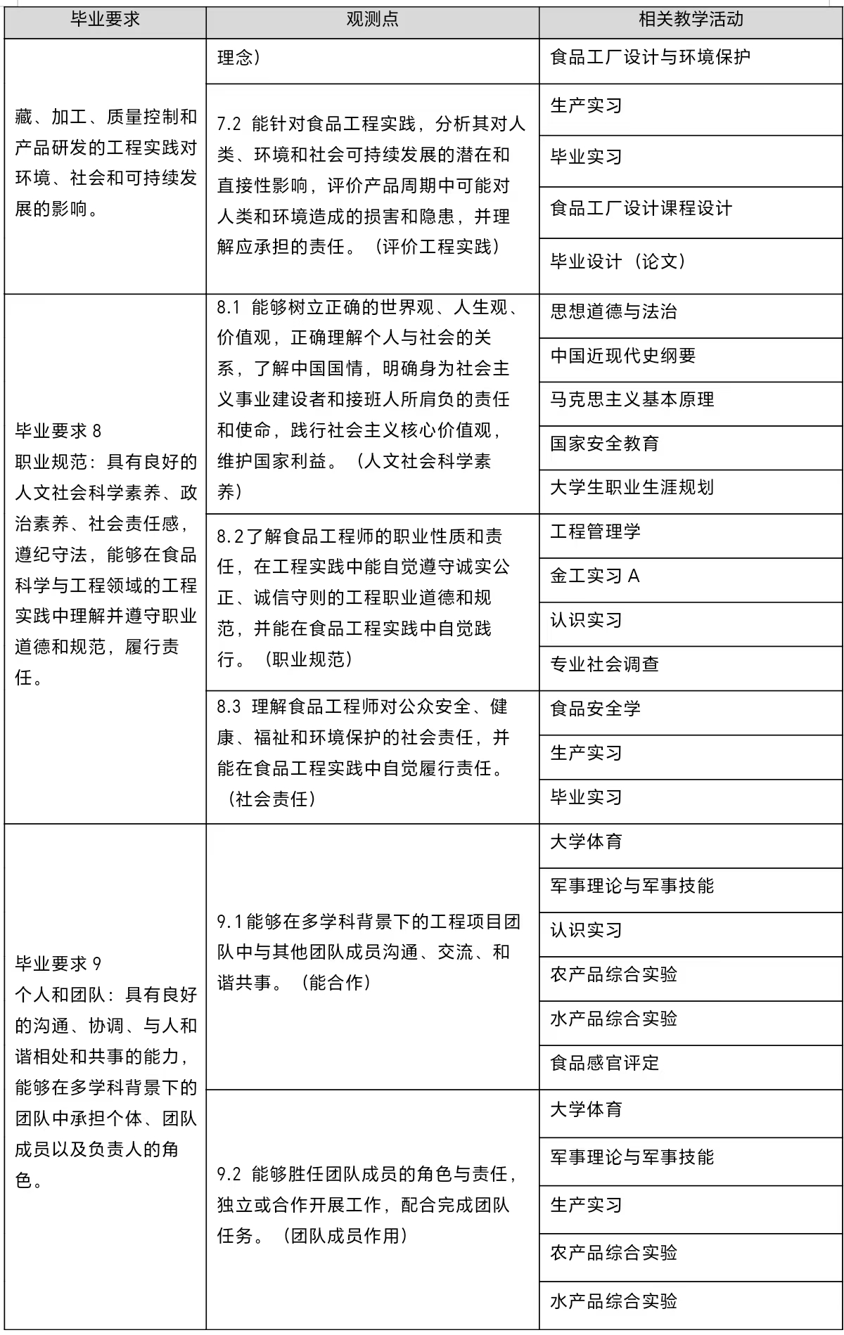 8. 职业规范:具有良好的人文社会科学素养、政治素养、社会责任感,遵纪守法,能够在食品科学与工程领域的工程实践中理解并遵守职业道德和规范,履行责任。