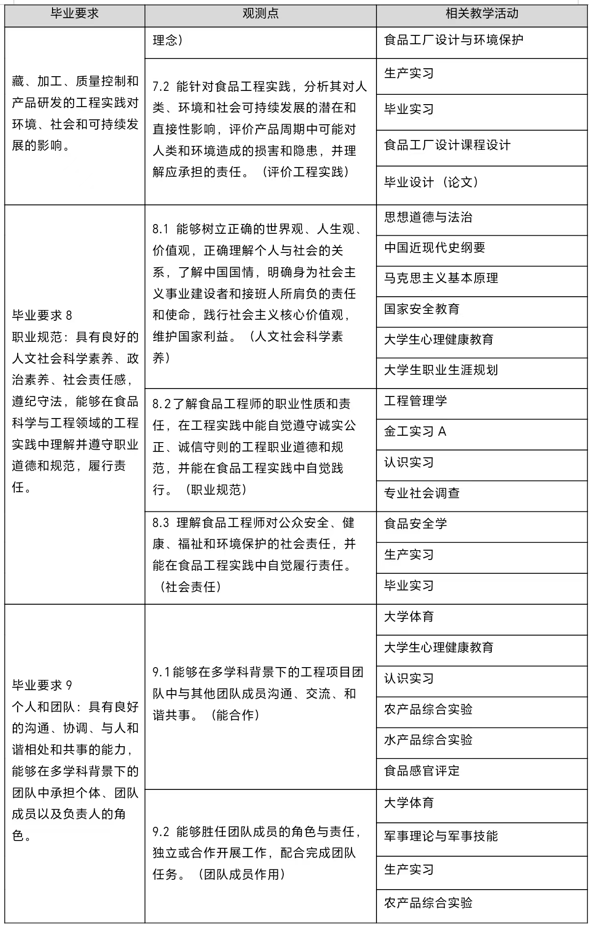 8. 职业规范:具有良好的人文社会科学素养、政治素养、社会责任感,遵纪守法,能够在食品科学与工程领域的工程实践中理解并遵守职业道德和规范,履行责任。