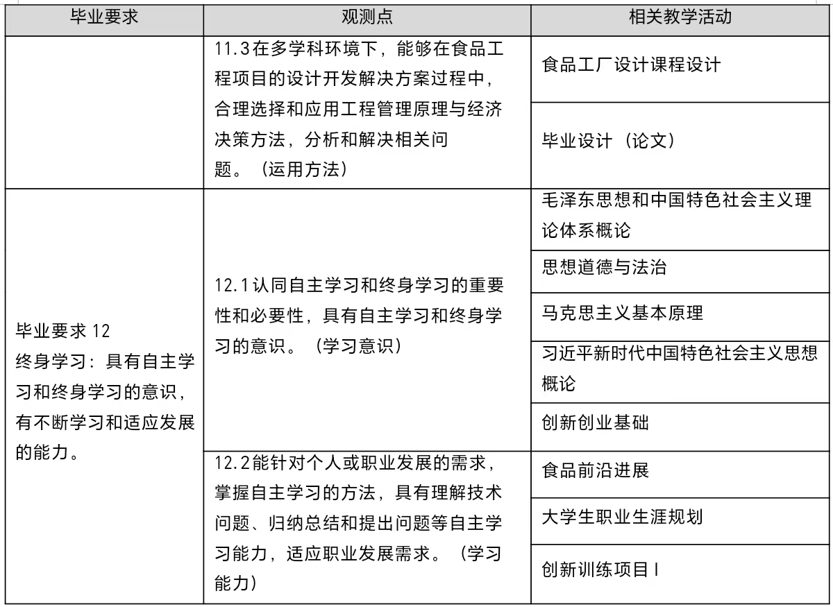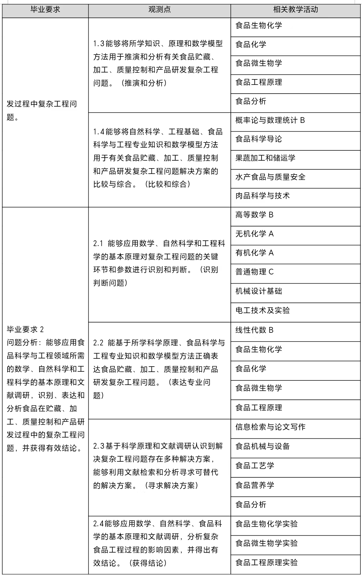 1. 工程知识:具有从事食品科学与工程领域所需的高等数学、数理统计等数学知识,大学物理、有机化学、分析化学等自然科学知识,工程制图、机械设计基础等工程基础知识,以及生物化学和微生物学等生物科学、食品科学与工程专业知识,并能够用于解决食品贮藏、加工、质量控制和产品研发过程中复杂工程问题。