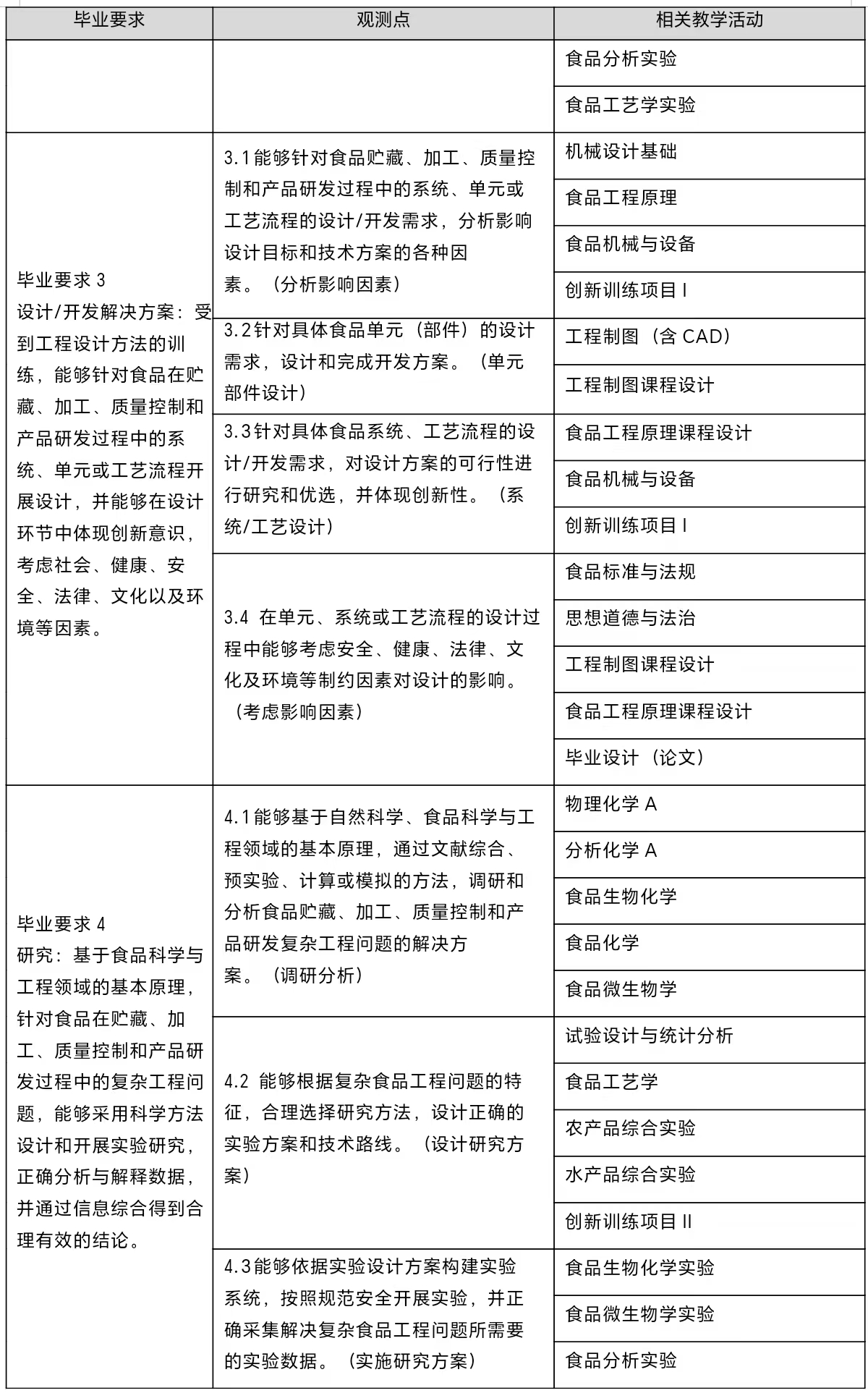3. 设计/开发解决方案:受到工程设计方法的训练,能够针对食品贮藏、加工、质量控制和产品研发过程中的系统、单元或工艺流程开展设计,并能够在设计环节中体现创新意识,考虑社会、健康、安全、法律、文化以及环境等因素。