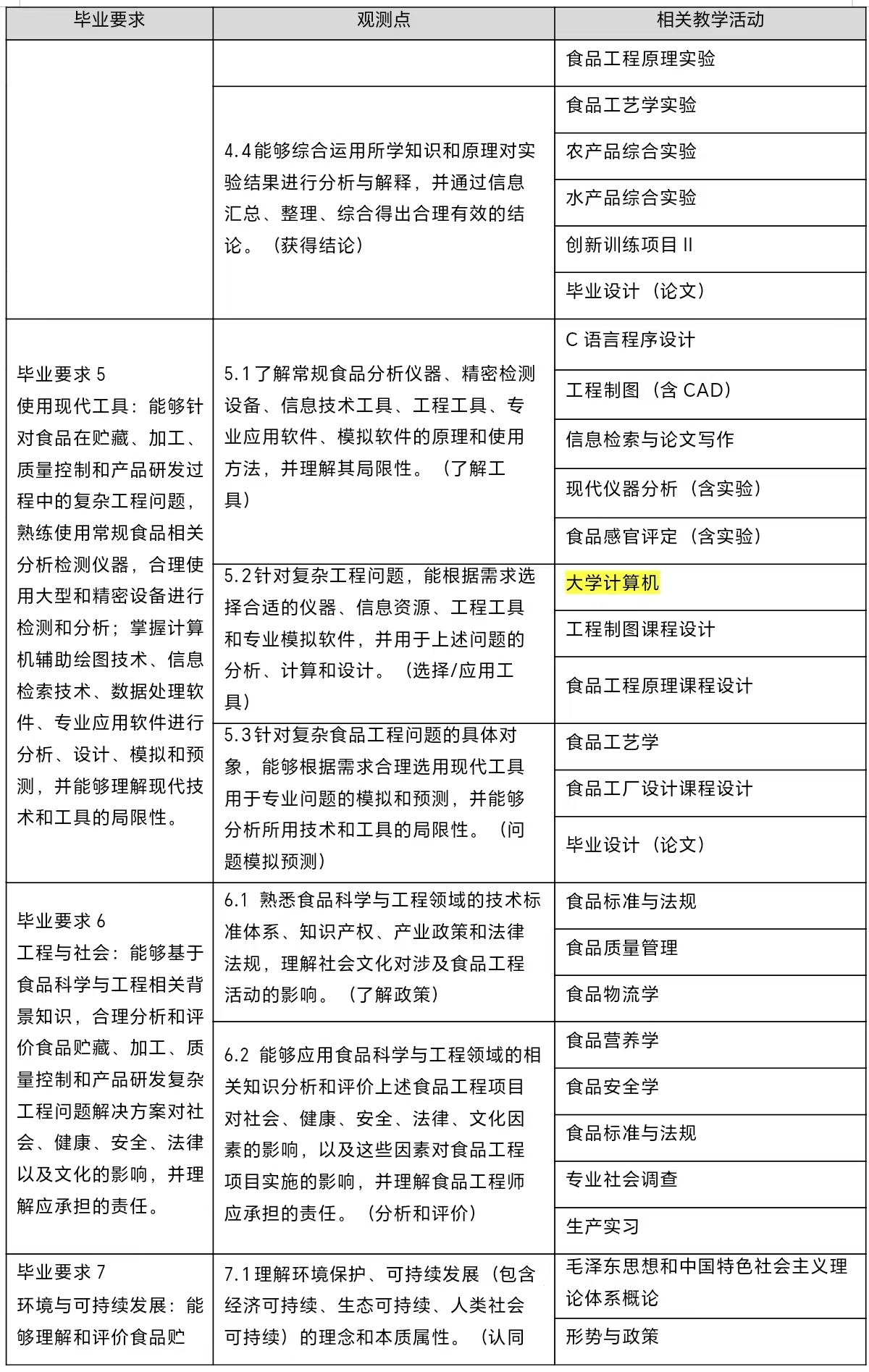 5. 使用现代工具:能够针对食品贮藏、加工、质量控制和产品研发过程中的复杂工程问题,熟练使用常规食品相关分析检测仪器,合理使用大型和精密设备进行检测和分析;掌握计算机辅助绘图技术、信息检索技术、数据处理软件、专业应用软件进行分析、设计、模拟和预测,并能够理解现代技术和工具的局限性。