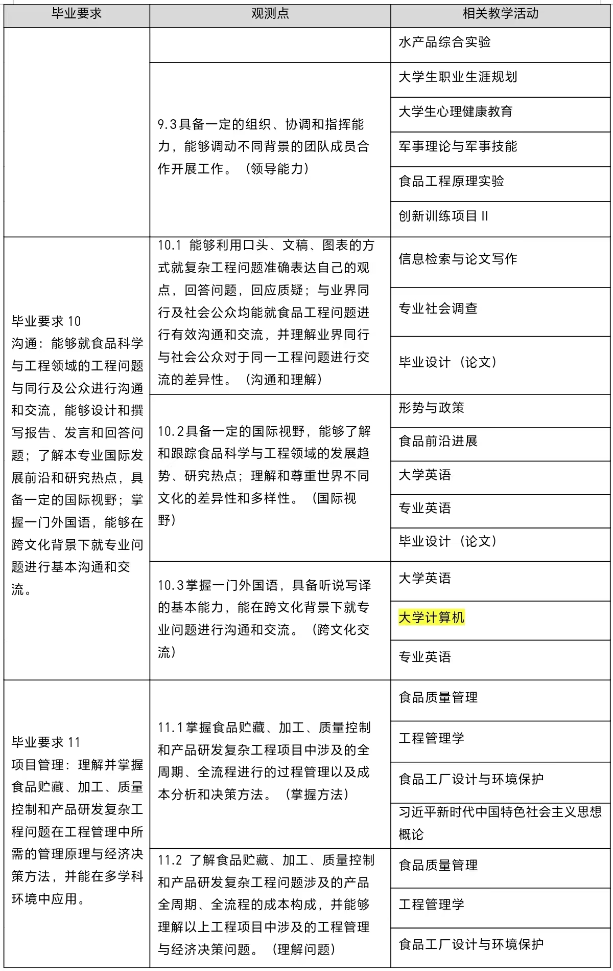 10.沟通:能够就食品科学与工程领域的工程问题与同行及公众进行沟通和交流,能够设计和撰写报告、发言和回答问题;了解本专业国际发展前沿和研究热点,具备一定的国际视野;掌握一门外国语,能够在跨文化背景下就专业问题进行基本沟通和交流。