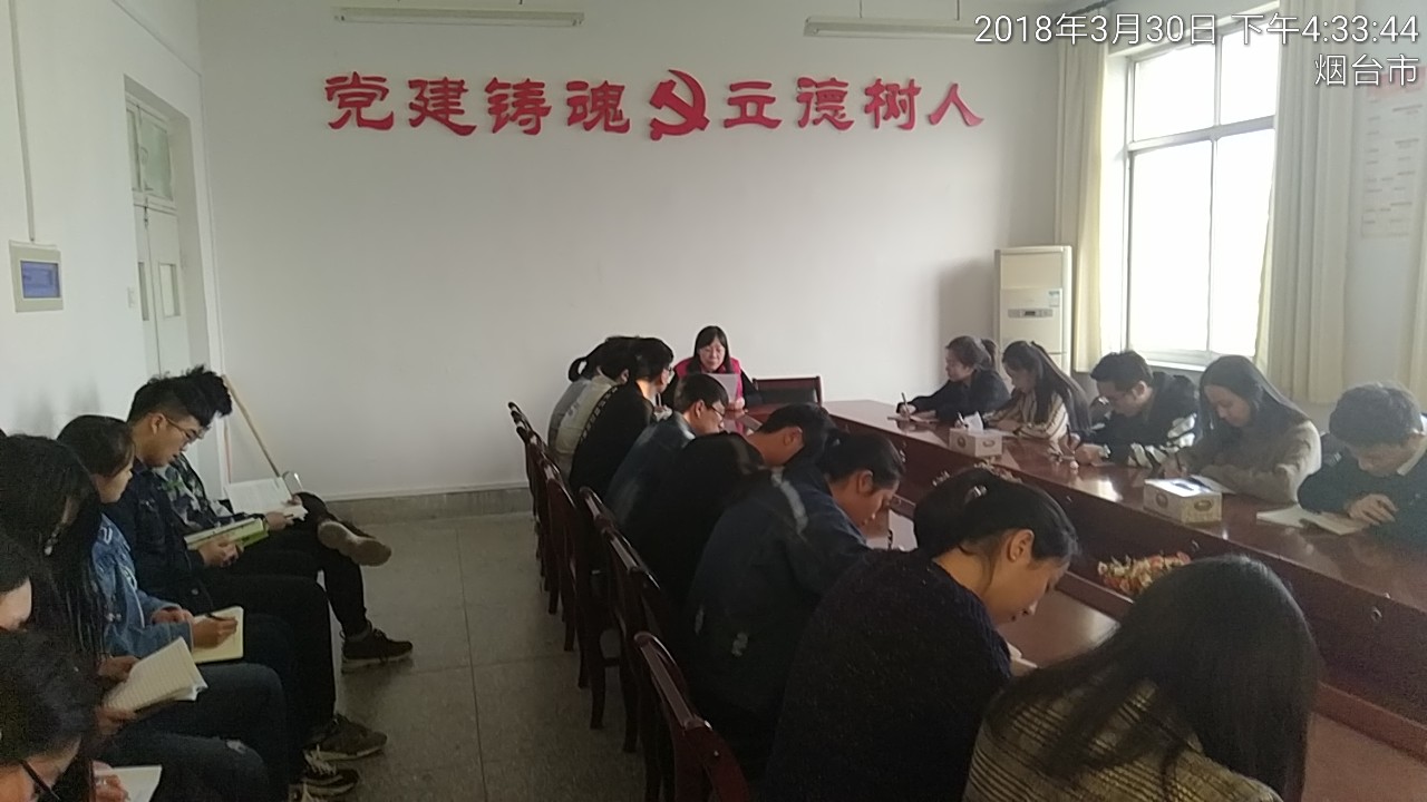 为使全体学生党员统一思想认识,认真学习理论知识,提高政治觉悟,牢固树立正确的世界观、人生观和价值观,2018年3月30日,我院学生支部开展了“两学一做”专题学习——学习“两会”精神,学生支部全体成员参加会议。