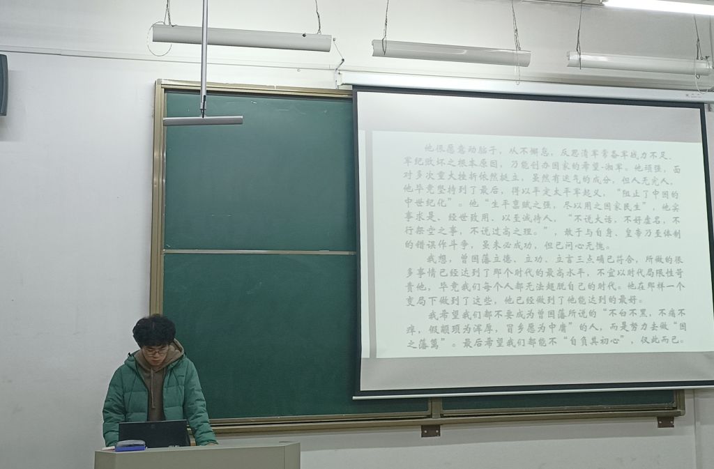 本次活动的阅读书目是《曾国藩传》。活动过程中,主持人通过PPT向同学们详细地介绍了此书的作者,创作背景,主要内容和精彩语段,同学们对曾国藩有了更加深刻的了解。了解了为何曾国藩乃晚清第一名臣,被誉为“官场楷模”“千古完人”;了解了他倡导西学,开启“同光中兴”的辉煌经历。主持人介绍完毕后,同学们各抒己见,积极发表了自己阅读此书的见解和感悟,纷纷表达了对曾国藩的敬佩之情。(英国上市公司365 撰稿: 解家豪 摄影: 张爱珍 审核: 李卫东)