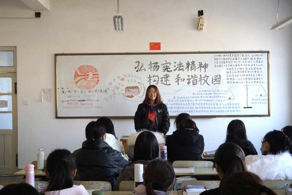 活动伊始,各班团支书先为同学们讲述本次活动的目的是让同学们更加深刻的认识宪法,加强法律意识。紧接着,各班级同学以演讲、情景剧等不同的形式了解了宪法在日常生活中起着很大作用。在活动的最后阶段,各班团支书进行总结,要求大家在生活中自觉地维护宪法,做一名遵纪守法的大学生。