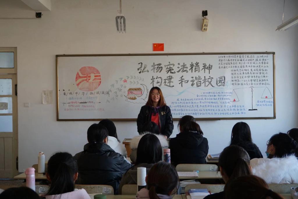 活动伊始,各班团支书为同学们讲述本次活动旨在让同学们更加深刻的认识宪法,增强法律意识。各班级同学以演讲、情景剧等不同的形式,结合自身经历,讲述了自己对宪法的认识及宪法在生活中的重要作用。最后,各班团支书进行总结,并要求大家在生活中一定要自觉地维护宪法,做一名遵纪守法的大学生。