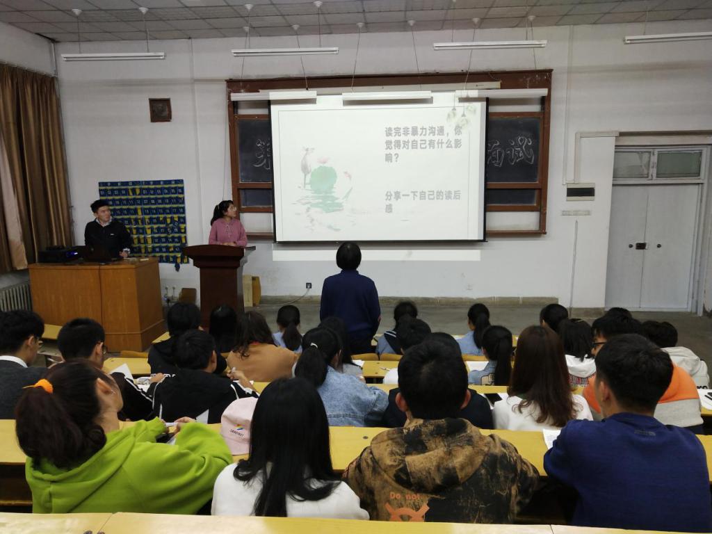 本次活动以马歇尔·卢森堡的《非暴力沟通》为推荐阅读书目。活动伊始,主持人简明扼要指出沟通四要素,即:观察、感受、需要、请求,并从爱他人、爱自己、爱生活三个方面阐述了书中神奇而平和的非暴力沟通方式。随后,同学们以“你认为什么是非暴力沟通、你有过语言暴力吗、你受过语言暴力的伤害吗”为讨论话题,各抒己见,活动在讨论声中圆满结束。