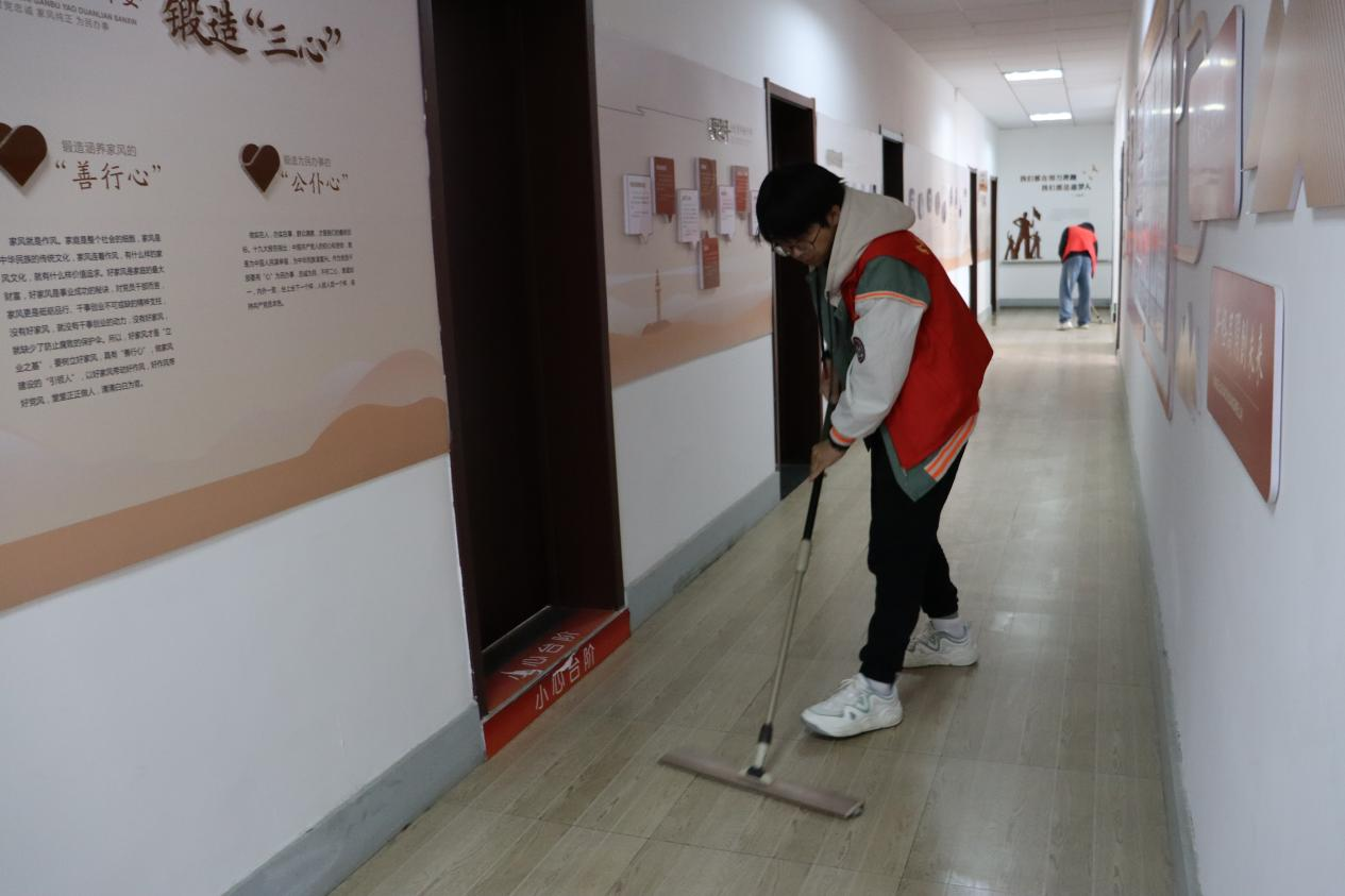 青年志愿者们科学分工、密切配合。环境清洁组的共青团员们充分发扬 “爱国、进步、民主、科学” 的五四精神,手持专业清洁工具,对社区楼道展开地毯式清洁攻坚。面对积灰的墙角、黏腻的扶梯,他们无惧脏污、俯身劳作,以 “不放过一处死角” 的严谨态度,让每一寸公共空间焕发新生。在服务过程中,青年们展现出良好的组织纪律性和团队协作精神,用汗水与热忱践行 “强国有我” 的青春誓言,在基层实践中书写新时代五四精神的生动注脚。