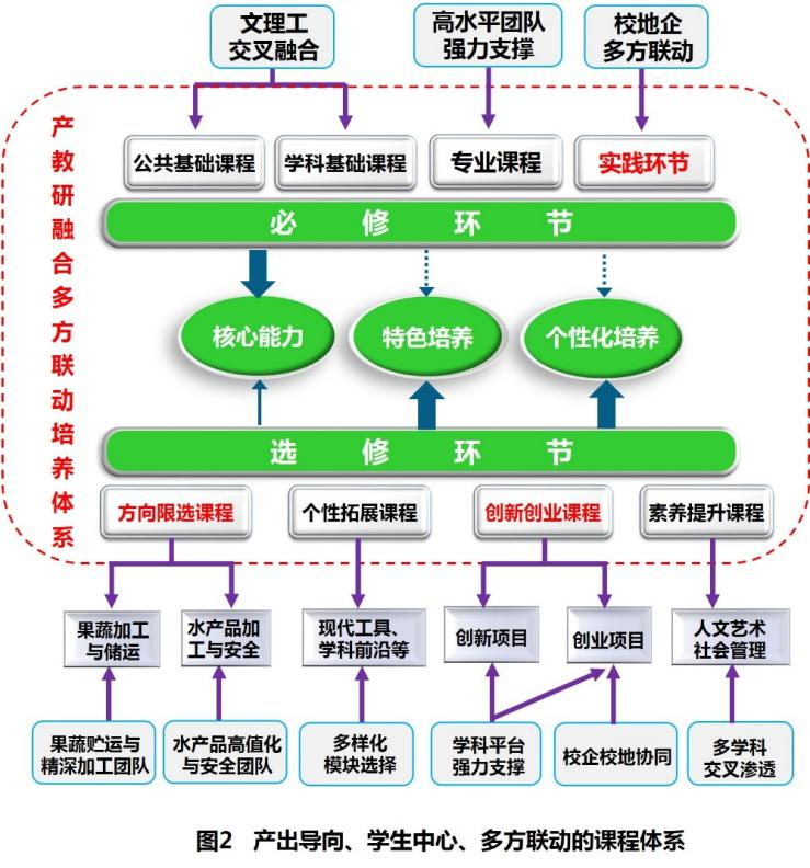 构建与国际工程教育目标接轨、“ 文、理、工”交叉融合、高层次人才引领、学科平台与校企校地联合交互支撑、多方联动协同育人体系。强化工程教育,建立提升工程创新能力的实践教学体系:以知识学习、工程应用和创新实践过程为纵向并行要件,以实践教学、科研项目和科技竞赛为横向交互要件,以教学方法和实践平台为连接与支撑,形成全程培养工程创新能力的食品专业实践教学构架。必修环节支撑专业核心能力,选修环节按“特色、拓展、提升”功能实施模块化分类,满足学生个性化发展和特色发展需求。