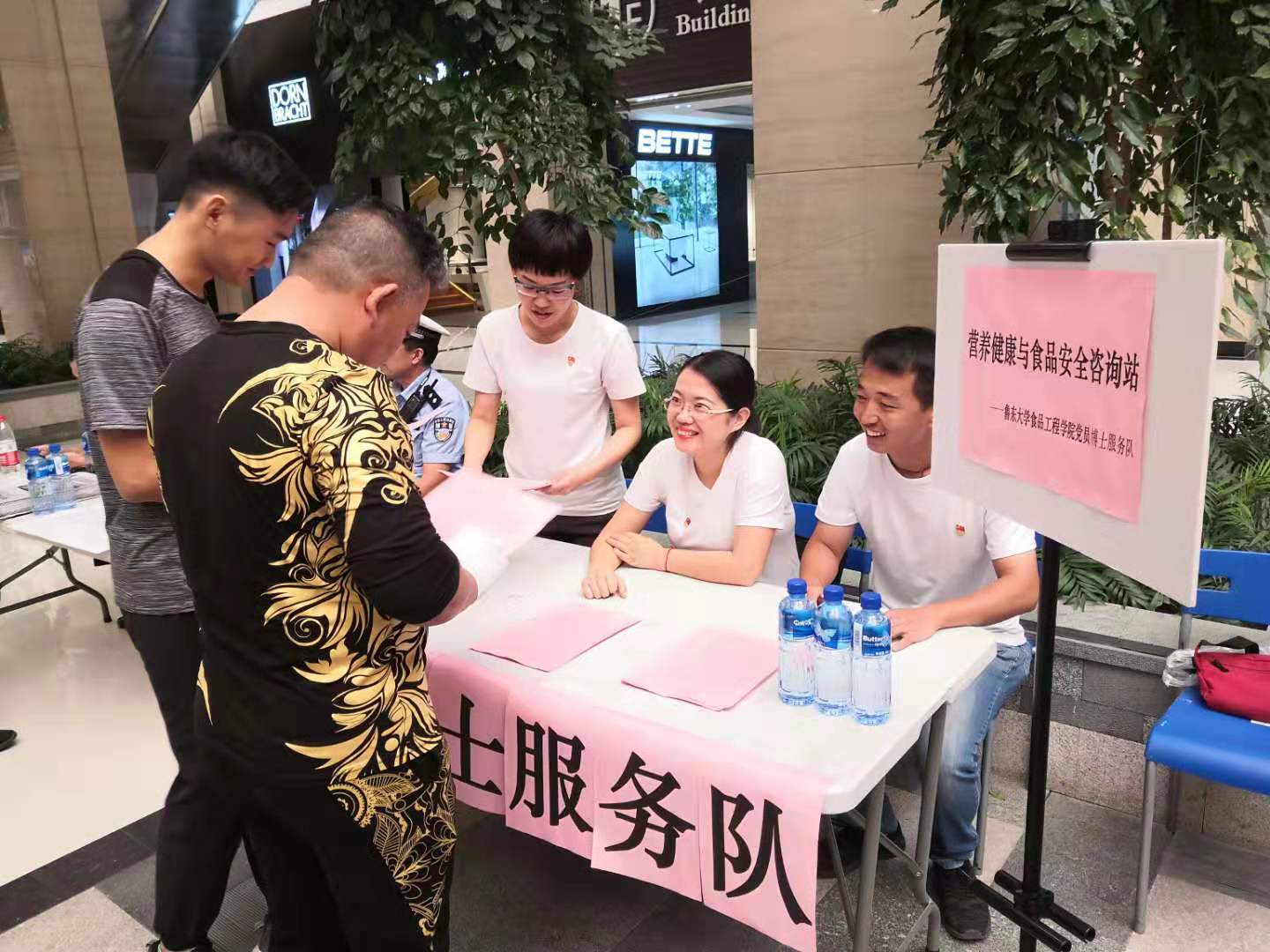 9月1日,我院“讲营养·送健康”党员志愿服务队积极联系并参加了卧龙园“砥砺奋进新时代,不忘初心铸辉煌”市民“文化大集”活动,以“营养健康和食品安全”为主题,在大集上设立便民服务点,就营养健康、食品安全、合理膳食等方面为社区居民提供咨询服务、进行科普宣传,受到了群众的热烈欢迎。