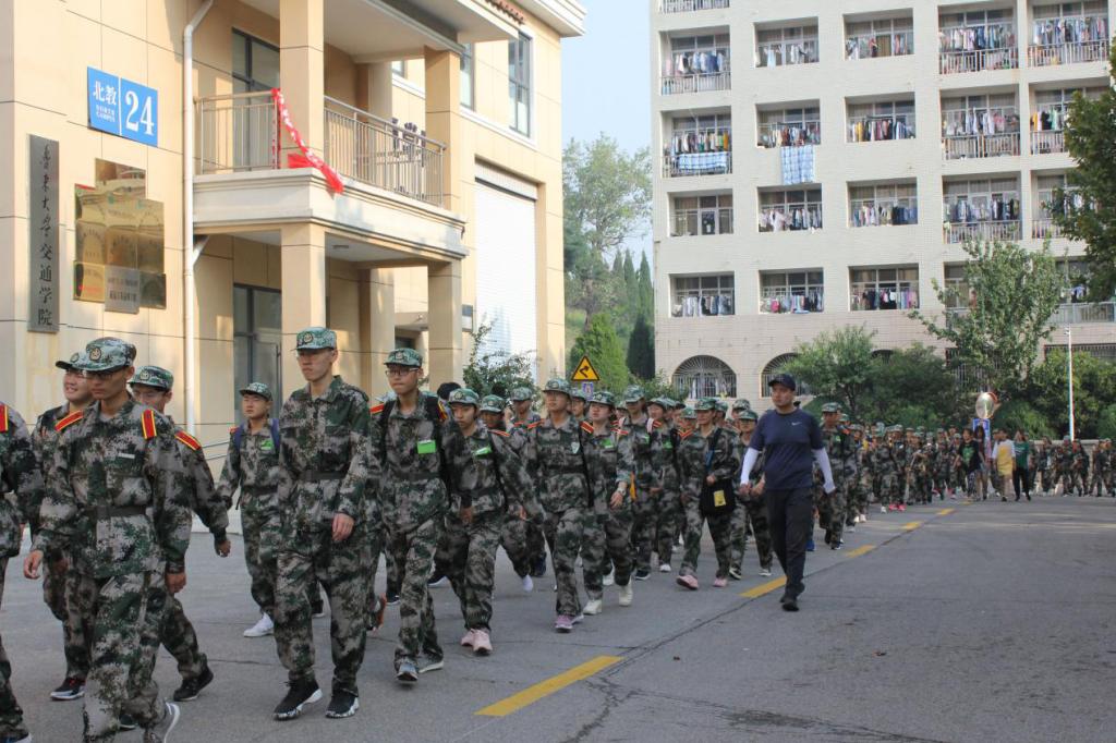 早晨6:30,学院新生于北区风雨操场集合完毕,7:40全体新生从北区风雨操场正式出发,途经金工实训基地、交通学院,沿黄金顶山道上山,穿过学校后山消防通道前行至思源湖,再经校友园至乳子湖最后回到军训场地,全程约5.6公里。拉练途中,新生们以3人纵队为一前进排面,步伐整齐,秩序井然,旗手们高举学院旗帜,边行进边唱军歌、喊口号,全体新生意气风发,互相扶持,最终顺利完成军训拉练任务。