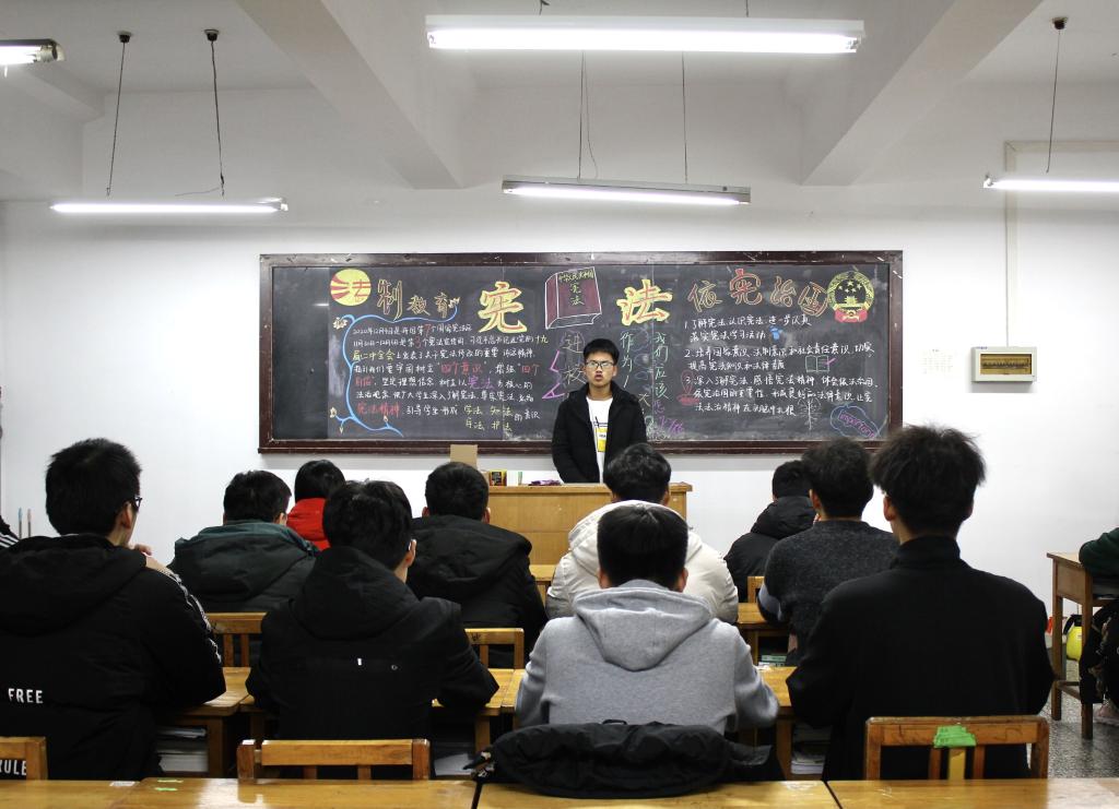一是开展宪法晨读活动。各班集体朗读《中华人民共和国宪法》序言及正文中的部分章节、条款,晨读后同学们交流讨论,各班班长组织同学们采用提问的方式进行知识问答,同学们踊跃表达自己对宪法的理解。二是开展“宪法进校园”主题活动。各班通过现实生活中的案例,以主题板报和情景剧等多种形式讲解宪法知识,各班团支书系统讲述了宪法的发展历程,对一些真实、典型的案例进行分析比较,诠释了宪法的现实意义。三是开展主题海报设计比赛。比赛以“学宪法,讲宪法”为主题,期间,参赛者以宪法的性质、宪法的发展、宪法的实施、宪法的遵守和宪法的宣传教育等主题内容为主,以海报的色彩、内容形式、版面创意等因素为辅,在规定时间内完成任务,呈现出精美的设计作品。