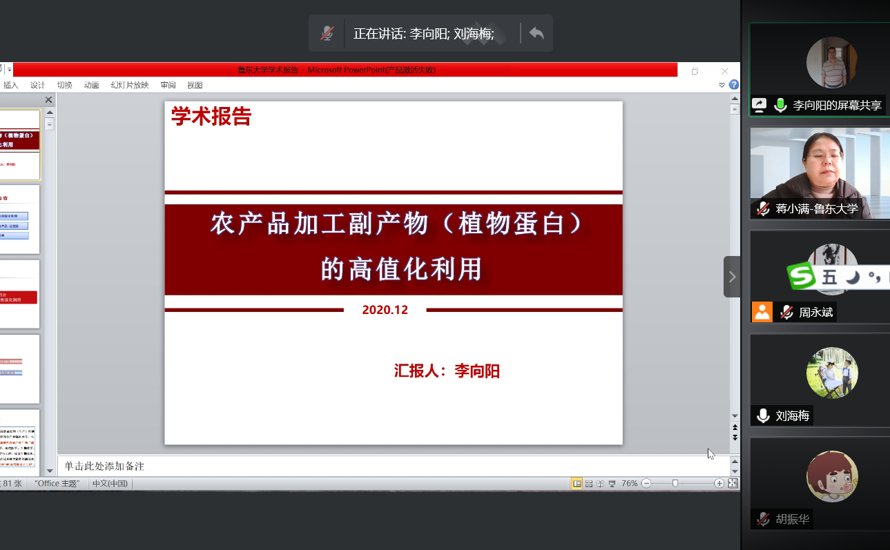 1月22日,山东农业大学李向阳教授应学院邀请在线上为全体专业教师作了《农产品加工副产物(植物蛋白)高值化利用》的报告。报告会由院长蒋小满教授主持,学院班子成员、学院学术分委员会主任王平教授及30余位相关专业教师参加了本次报告会。