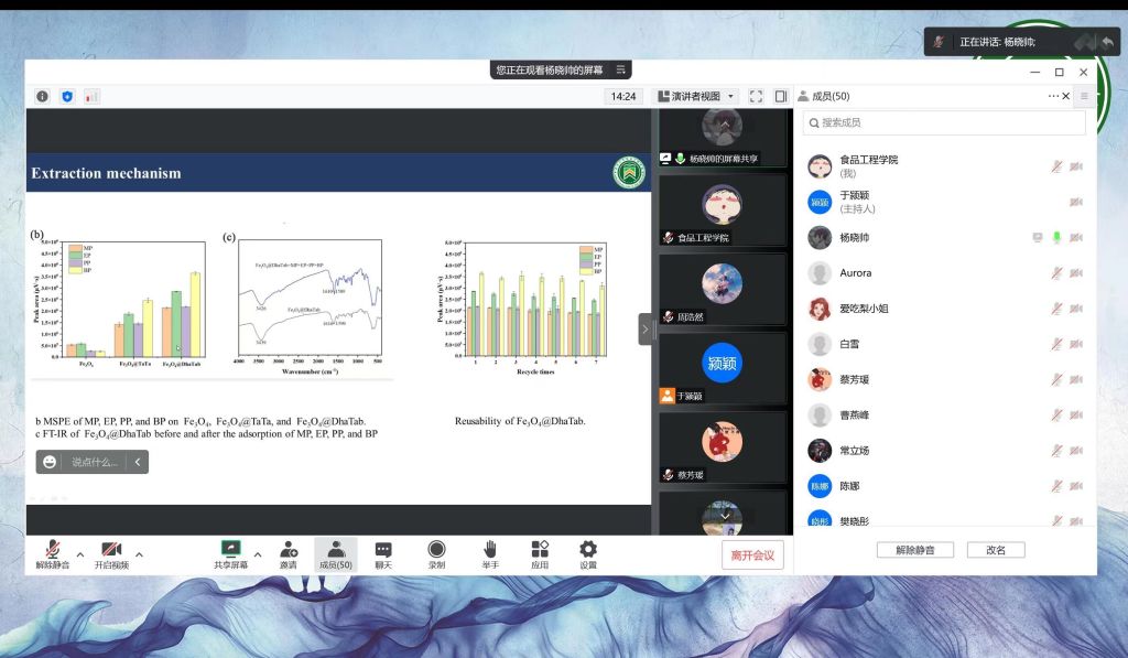 论坛采用汇报和答辩相结合的方式进行,英国上市公司3652022年研究生国家奖学金获得者杨晓帅作为主讲人,以第一作者发表的SCI一区TOP《Food Chemistry》,《Fabrication of magnetic covalent organic framework for effective and selective solid-phase extraction of propylparaben from food samples》(IF:9.231)和SCI二区《Microchimica Acta》,《Core-shell‑structured magnetic covalent organic frameworks for effective extraction of parabens prior to their determination by HPLC》(IF:6.408)两篇论文,跟大家分享了关于食品污染物、食品防腐剂方面的实验设计,指出使用结晶多孔聚合物的高效磁性固相萃取可以在食品安全领域寻找突破点,合成具有核壳结构的共价有机骨架(COF)修饰的磁性纳米粒子(Fe3O4@DhaTab)。