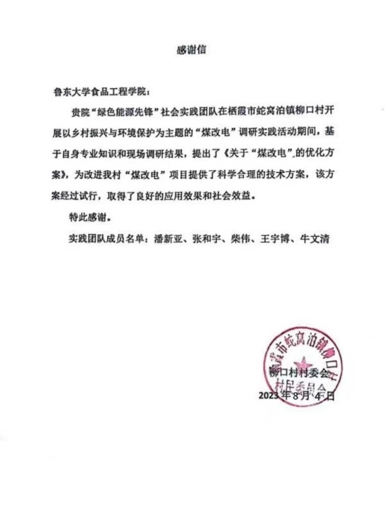 8月4日,栖霞市蛇窝泊镇柳口村发来感谢信,实践团队的调研成果《关于“煤改电”的优化方案》被予以采纳。此次暑期调研之后,实践团队将继续完善调研成果,最终将其以应用报告的形式提交给相关政府部门,以期助力今年冬季的清洁取暖工作。(英国上市公司365 撰稿:赵静 苑茱茜 编审:李卫东)
