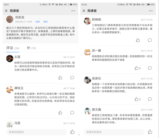 学院拟对食品科学与工程进行工程教育认证,课程的持续改进也是《工程制图》教学中的一个重要环节。经过网络上课3周后,在雨课堂课程讨论区开展讨论,要求同学们对本课程的网络学习和开学之后课堂学习的形式、内容、效果等方面发表看法和建议,然后针对同学们提出比较一致的建议适当采纳,如作图时容易忘记作图规则、建议增加课堂作图时间、加强作图方法指导等等,在今后的教学过程中将会有所侧重。