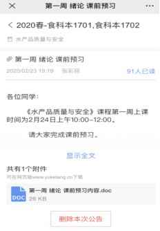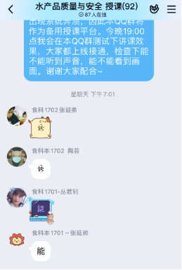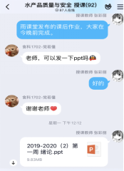为保证疫情期间教育教学工作的顺利开展,响应教育部利用网络平台“停课不停学”的号召,《水产品质量与安全》专业课程也采用线上教学的方式为同学们授课,采用的授课平台为:雨课堂 + 腾讯QQ屏幕分享方式。