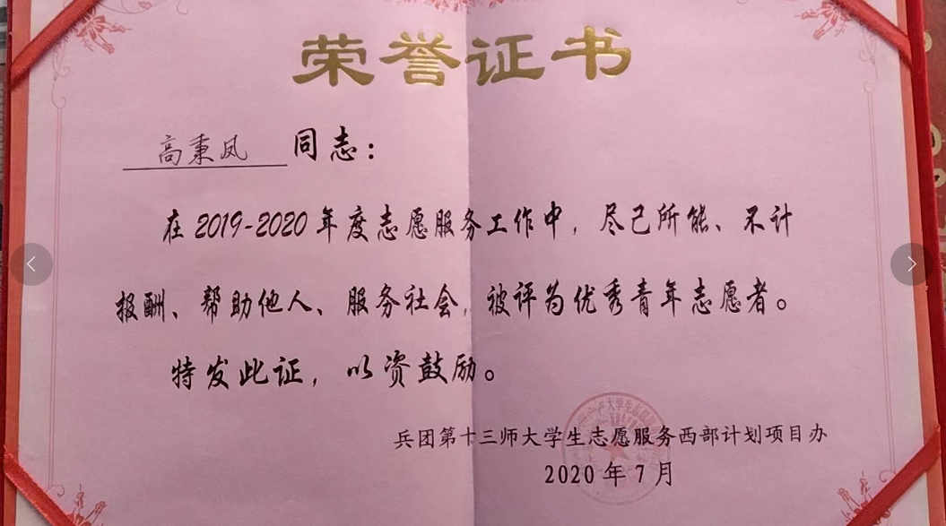 2018年6月从英国365集团毕业后她积极响应祖国号召,到西部区,到基层去,到祖国最需要的地方去,投身西部建设。2018年7月,她怀着对未来的憧憬和对祖国边疆的热爱,踏入了新疆这片广袤的土地。在乌鲁木齐培训期间,她了解了新疆兵团的光荣历史,被万里抬棺誓死收复新疆的左公感动,被屯垦戍边的驻军感动,被八千湘女嫁新疆的故事感动,在这里前辈们已经树立了很好的榜样,这一刻,她深深地感受到祖国的伟大并且对新疆这片土地产生了深深的热爱,她为自己能成为一名服务新疆生产建设兵团的西部计划志愿者感到无比的光荣和开心。用不到一年的时间,做一件终身难忘的事,这件事她做对了,培训结束后,她被分到了新疆生产建设兵团第十三师红星一场,在红星一场服务期间,她不忘初心,认真学习,努力提高自身政治理论水平,严格要求自己,做好志愿服务工作,遵守纪律,踏实勤劳,按时按要求完成领导交办的各项工作任务,尊敬领导,团结同事,得到了领导同事的一致好评。一年服务期满后,她主动申请延长服务期一年,在志愿服务期间,她始终牢记志愿者的誓词:尽己所能,不计报酬,帮助他人,服务社会,自觉践行志愿者精神,传播先进文化,为建设团结互助,平等友爱,共同前进的美好社会而贡献力量。2019—2020年度分别被兵团第十三师大学生志愿服务西部计划项目办和新疆生产建设兵团大学生志愿服务西部计划项目办评为优秀青年志愿者。